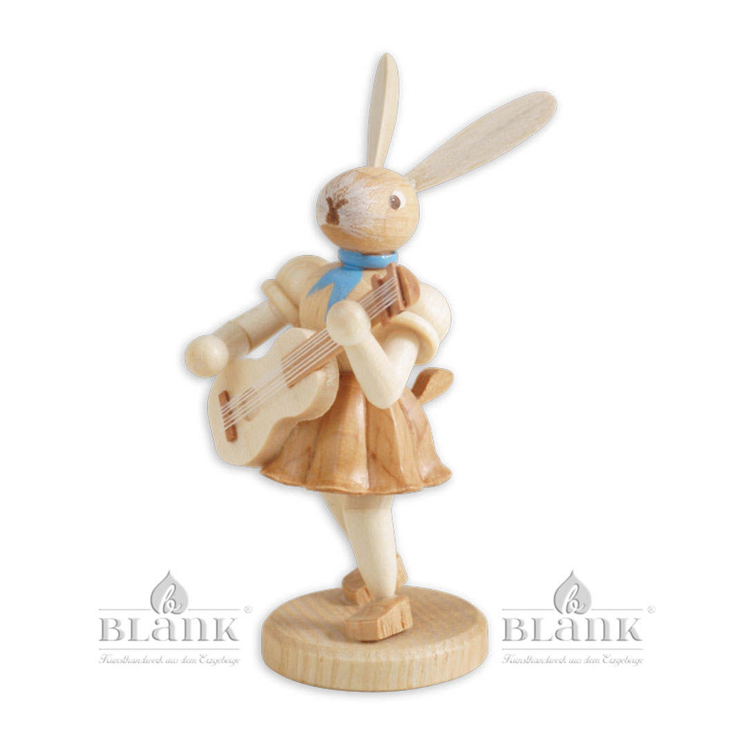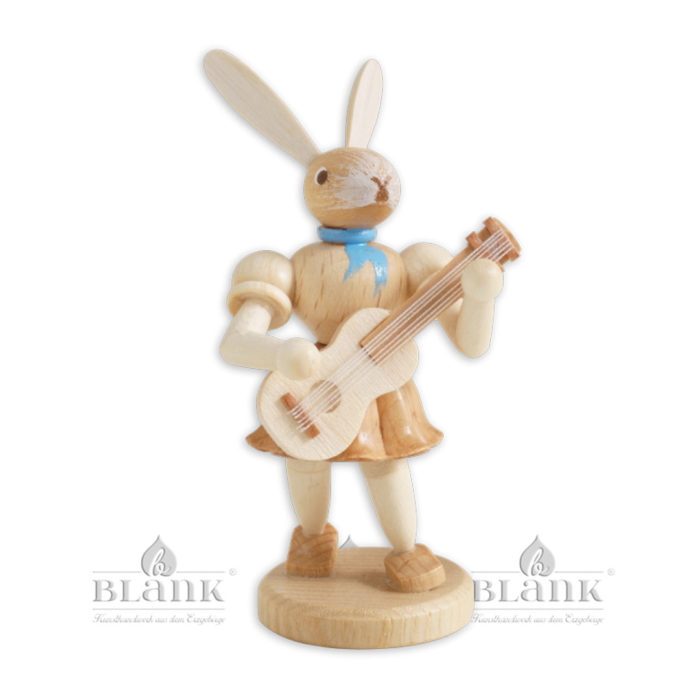 Zu den bekannten farbigen Osterhasen gesellen sich nun tanzende und swingende Osterhasen in Naturholzoptik. Dabei fällt ihre fröhliche, beschwingte Haltung ins Auge, die sofort Lust auf Frühling macht. Der 7,5 cm große Osterhase musiziert mit Freude auf seiner Gitarre: der geschwungene Korpus der Gitarre inklusive Schallloch ist mit sechs zarten Saiten bespannt, die auf millimetergroßen Stegen aufwendig von Hand angebracht wurden.. Dezent verziert mit einem blauen Halstuch spricht die individuelle Holzmaserung des sonst naturbelassenen Hasen für sich.